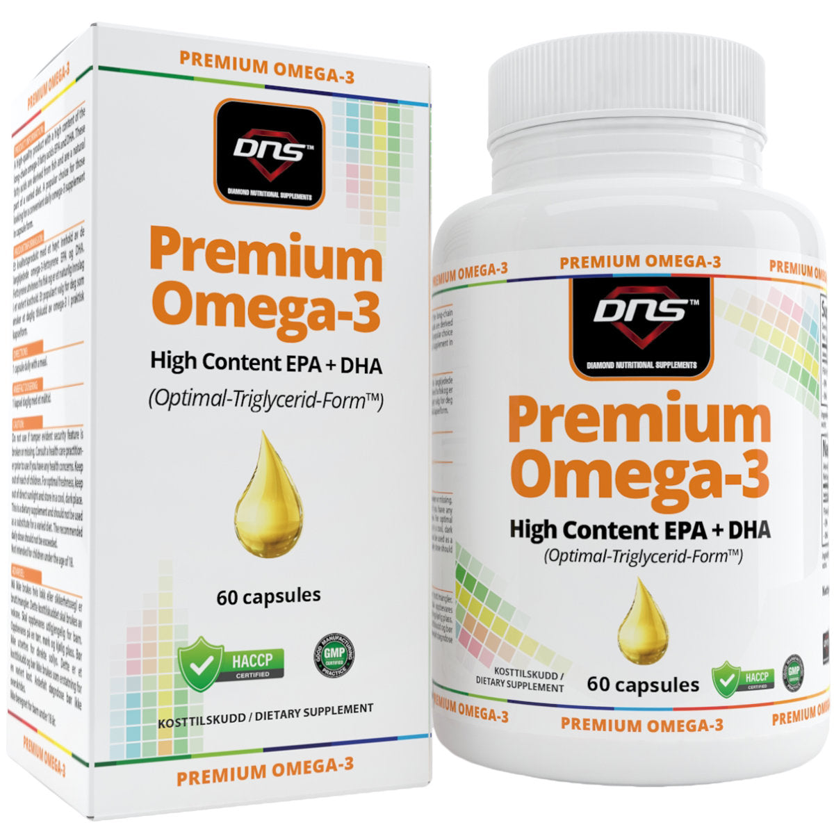 Premium Omega-3 fra DNS inneholder høykvalitets fiskeolje med et ekstra høyt nivå av de essensielle fettsyrene EPA og DHA i naturlig triglyseridform.